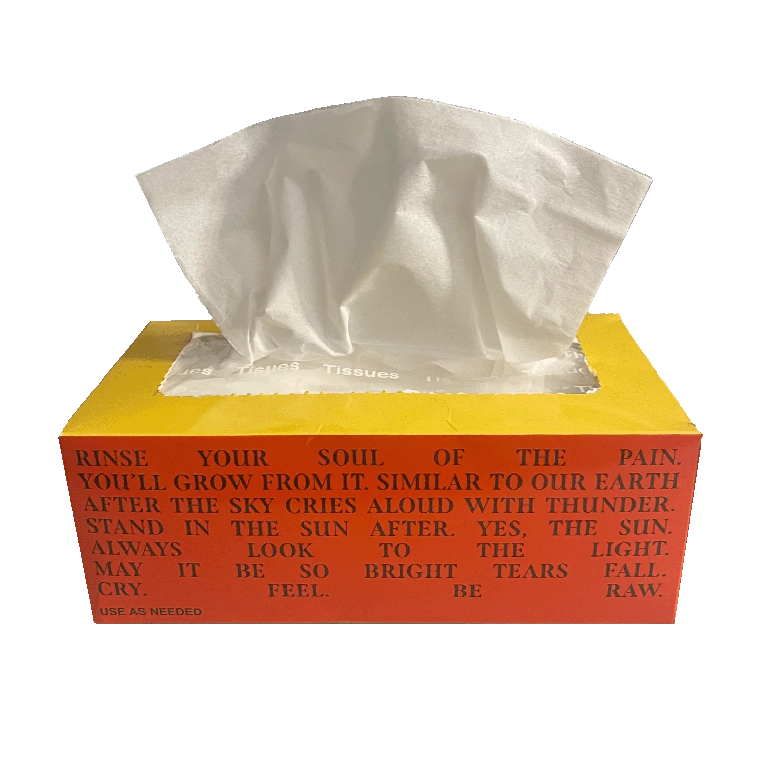 Limited edition, custom constructed and printed tissue box with actual 2-ply tissue, featuring artwork from Rap's Please Don't Cry album.