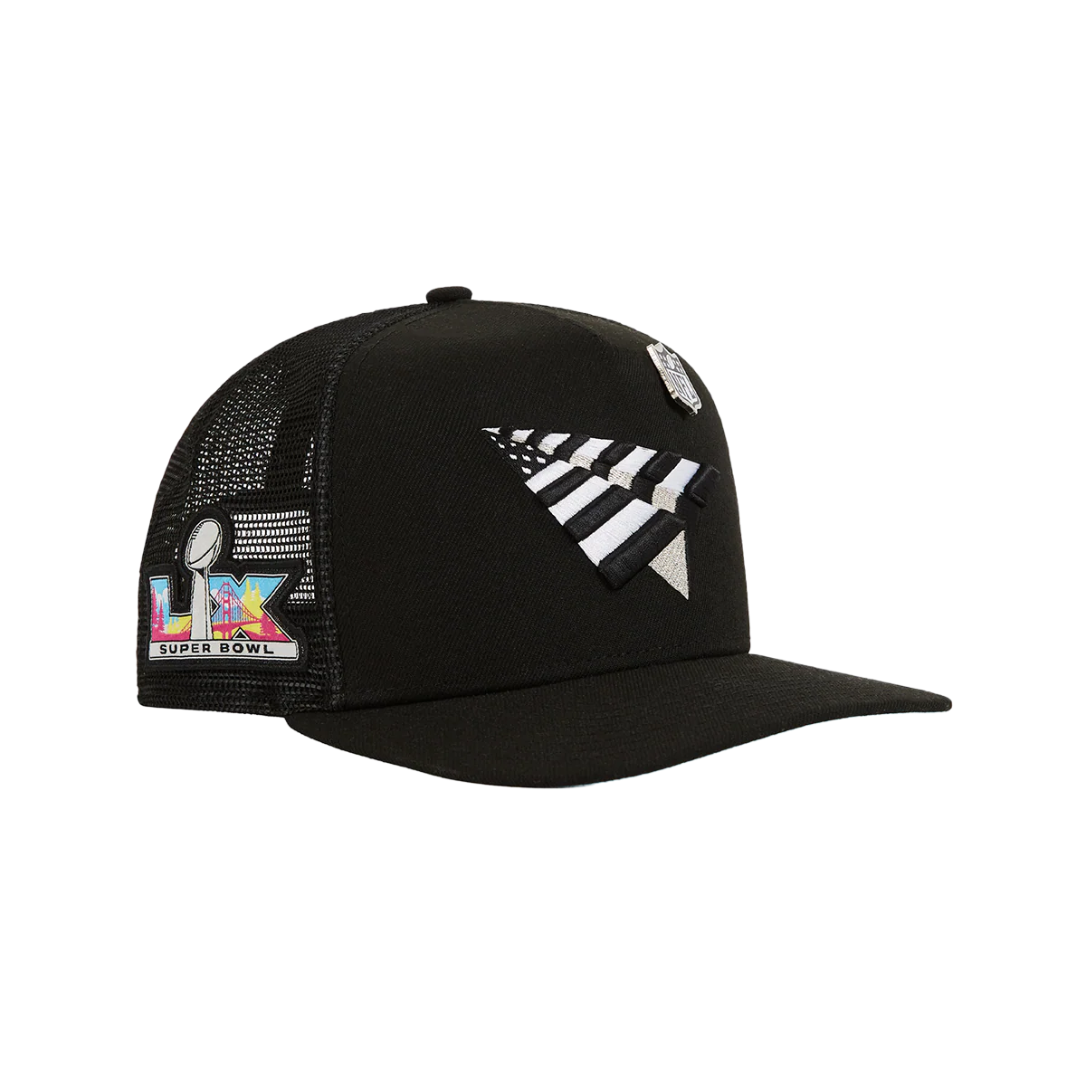Limited-edition Super Bowl LX snapback built with New Era’s 9FIFTY A-Frame silhouette. Featuring embroidered black, white, and blue detailing, Paper Planes artwork on the front, a blue under-visor, official NFL pin, and Super Bowl LX embroidery to commemorate the game.